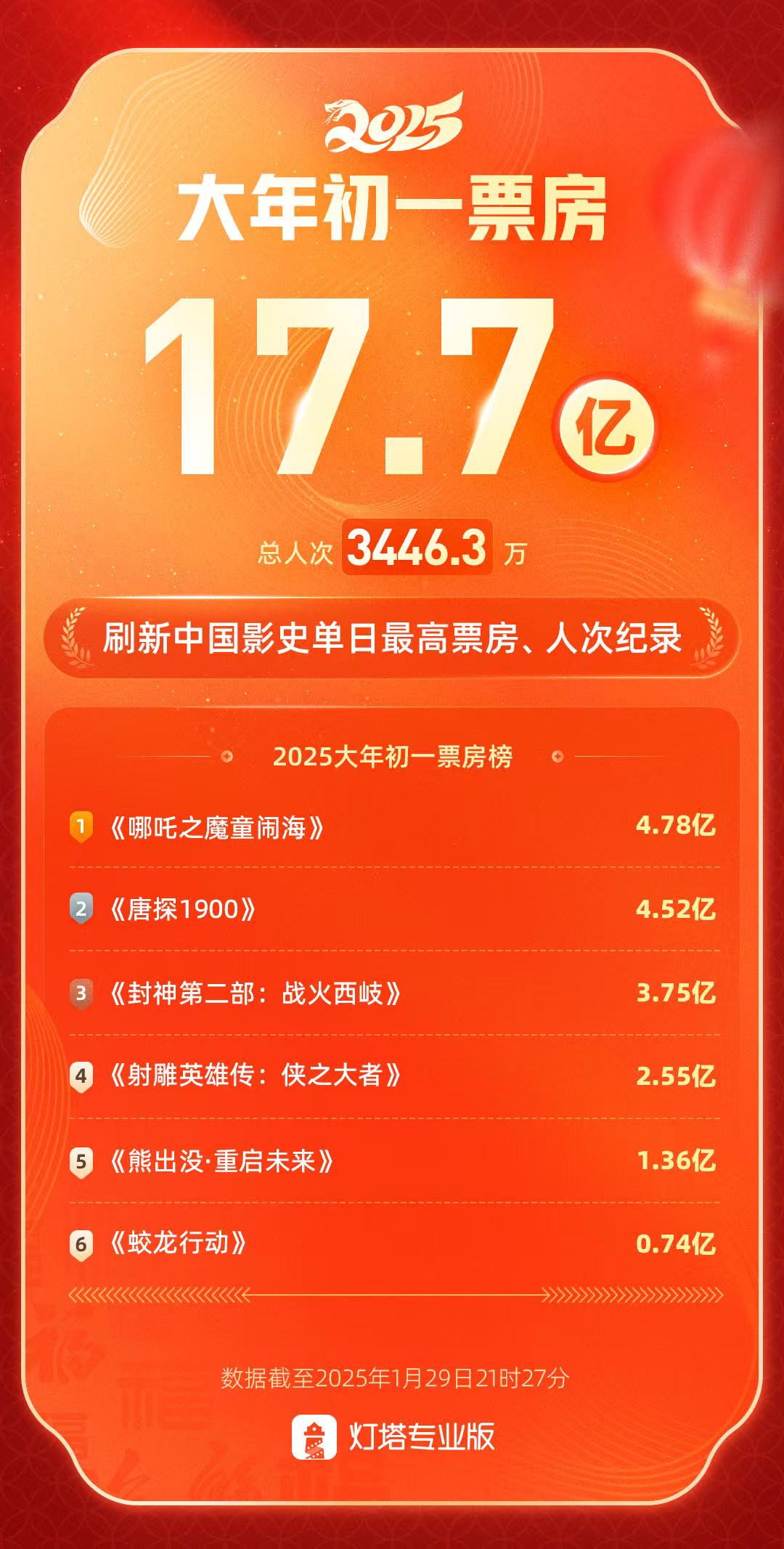 《哪吒之魔童闹海》《唐探1900》《封神第二部:烽火西岐》《射雕好汉传:侠之大者》《熊出没·重返未来》位列今日票房前五名,房已房记票房均已经破亿,经破其中前两名单日票房已经突破4亿,亿刷大盘泛起百花齐放的国影高票盛况!《哪吒之魔童闹海》在华北、史单实最事华中、华西地域大部份省份票房登顶,《唐探1900》笑傲西南地域、江苏、广东等省份,《封神第二部:烽火西岐》在上海等省份票房领跑,部份上一二线都市票房占比达49%略高于去年,主要由于《射雕好汉传:侠之大者》等影片在一二线都市揭示突出,上海逾越北京,重新夺回小年初一都市票房冠军,江苏连任小年初一省份票房冠军。
