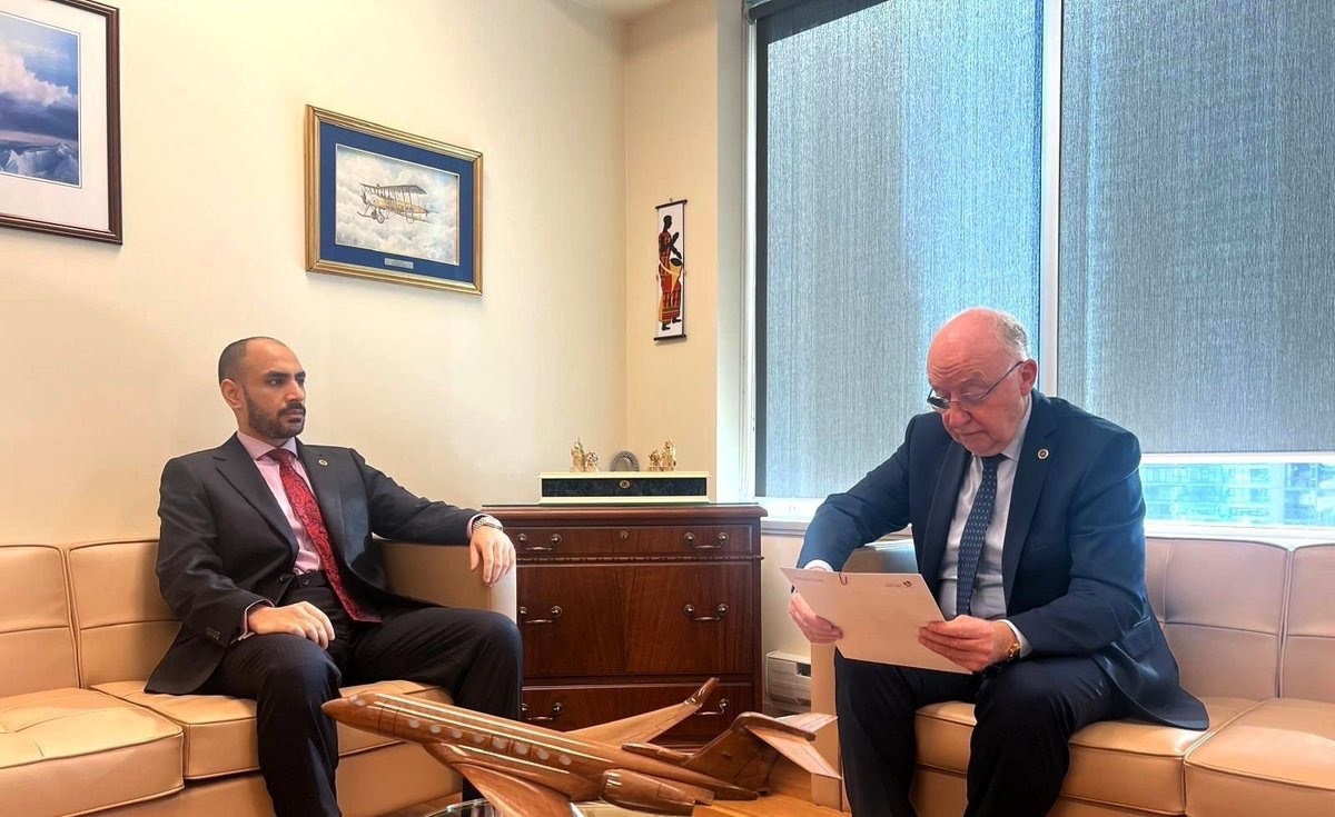 △卡塔尔常驻国内夷易近用航空机关代表阿卜杜拉·马尔基(左)20日向国内夷易近航机关理事会主席夏基塔诺递交信函