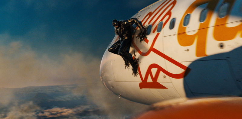 《毒液3》剧照。毒液在这里调侃了《碟中谍5》中扒飞机的阿汤哥。