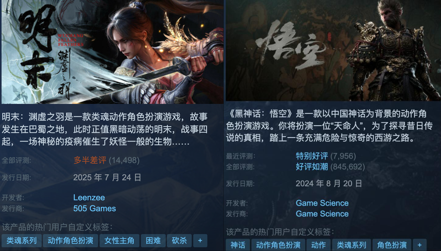 《明末:渊虚之羽》与《黑神话:悟空》在steam平台上的评分比力。